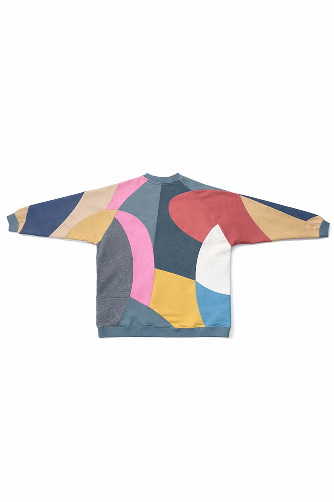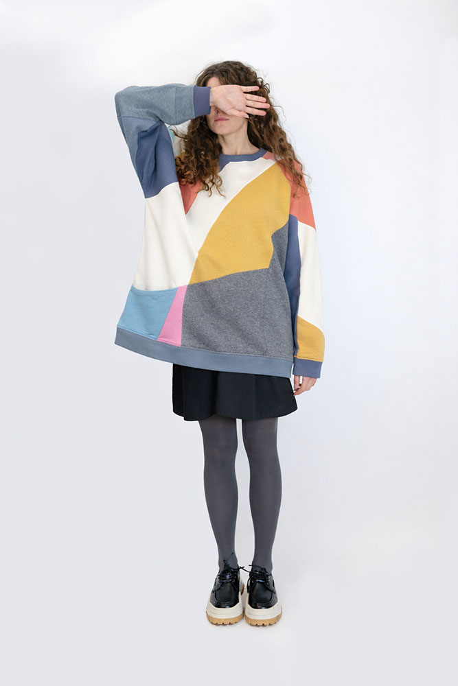 Buggy is a BIG piece of clothing that can be worn as a top or as a dress, depending on height. The design is developed especially for upcycling – so that small pieces of fabric and clothes can be used, instead of new material.