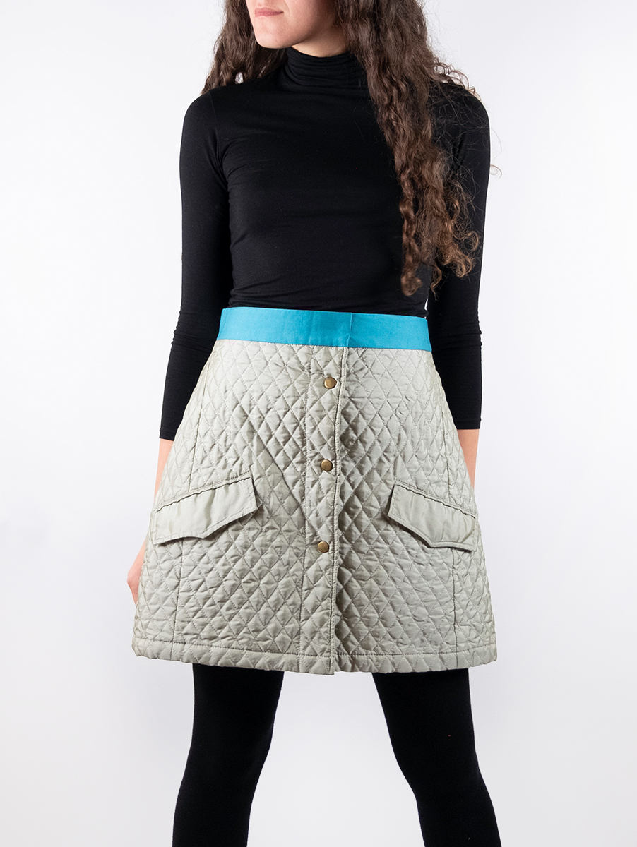 High-waisted A-line skirt with button snaps, hook & eye closing and front pockets